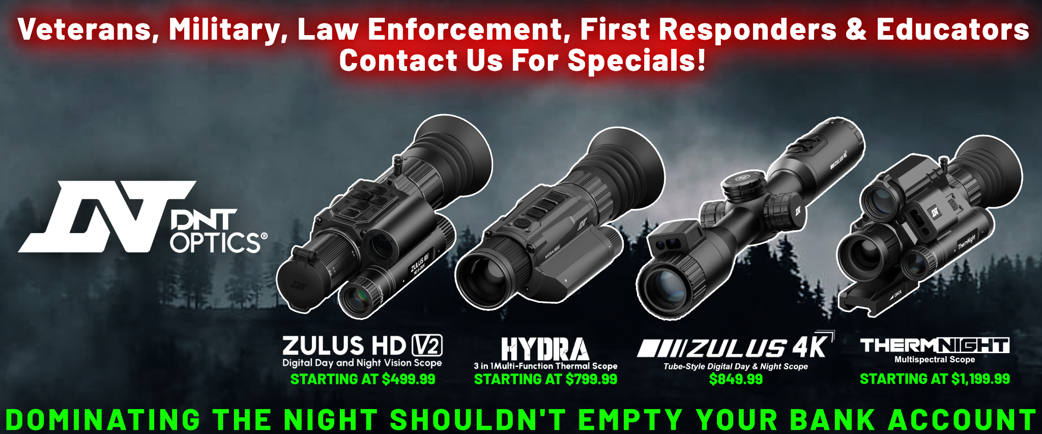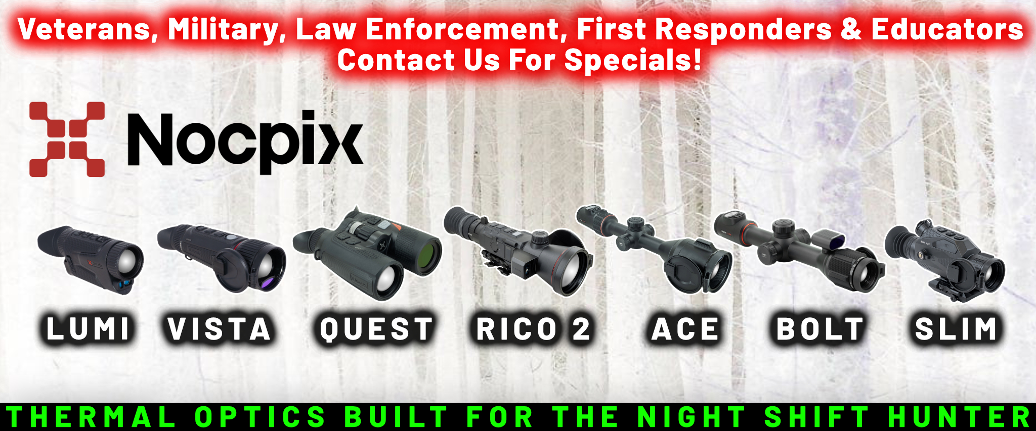 No matter what your game, Predator Hunter Outdoors has just what you need when it comes to hunting predators at night. Weapon-mounted hunting lights for your rifle, shotgun, compound bow, crossbow, and a complete line of night vision and thermal rifle scopes and handheld devices.