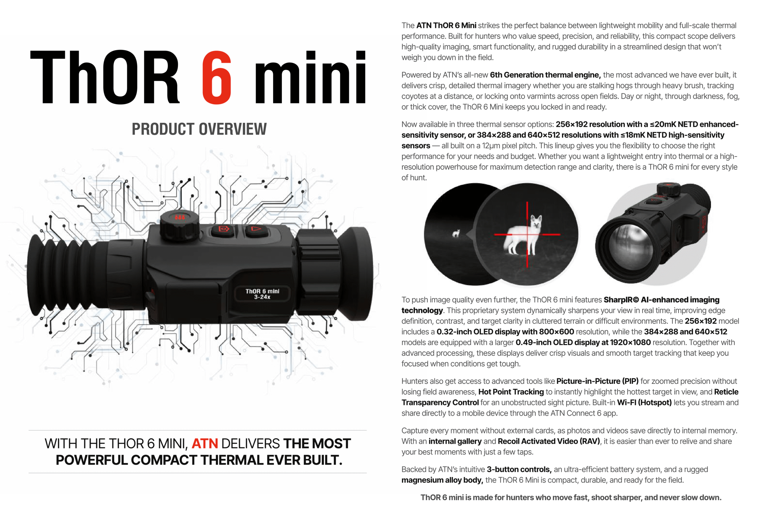 The ATN ThOR 6 Mini 640 Thermal Rifle Scope represents the highest performance tier in the Mini lineup, combining full 640×512 resolution with an ultra-compact design ideal for lightweight rifle builds.