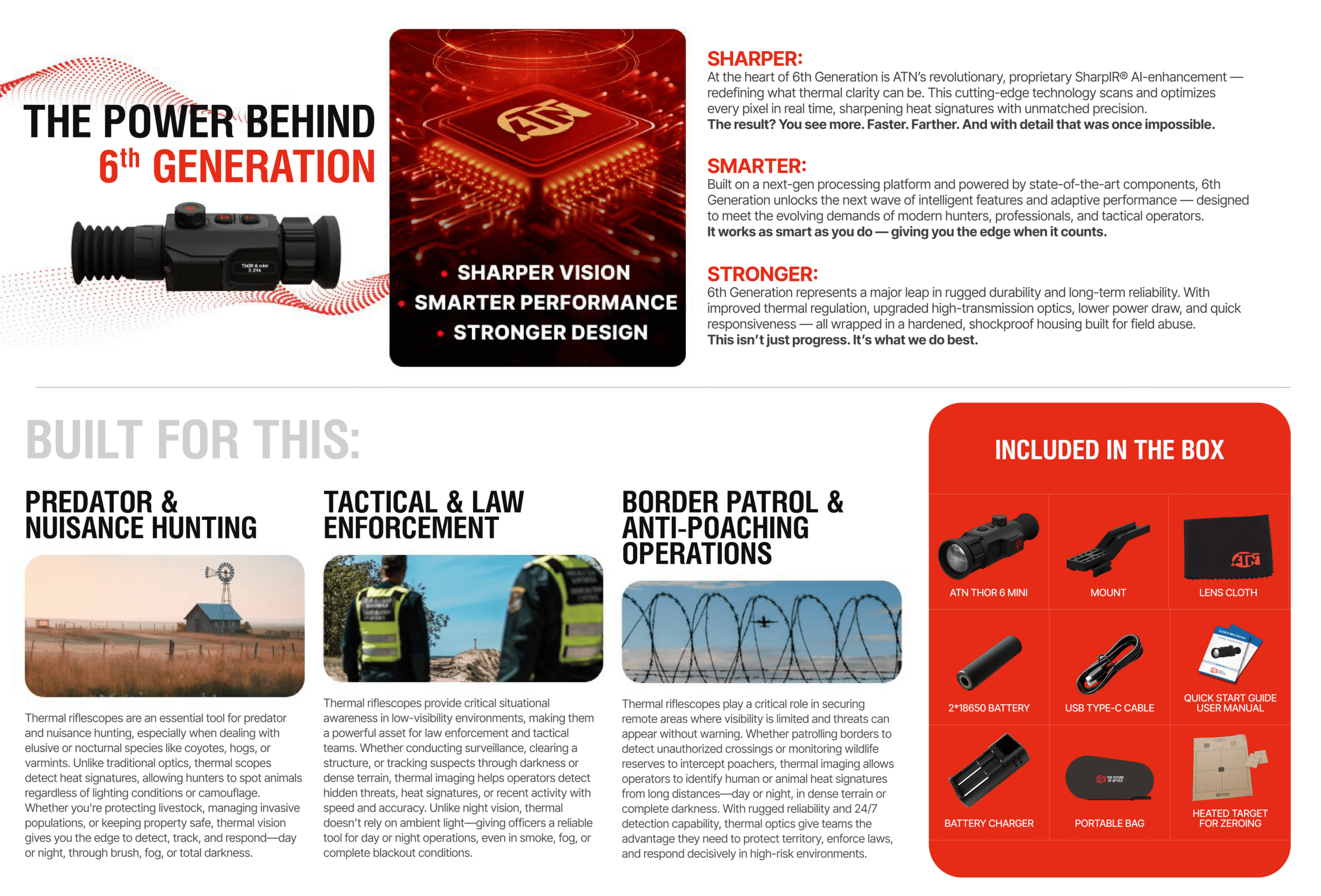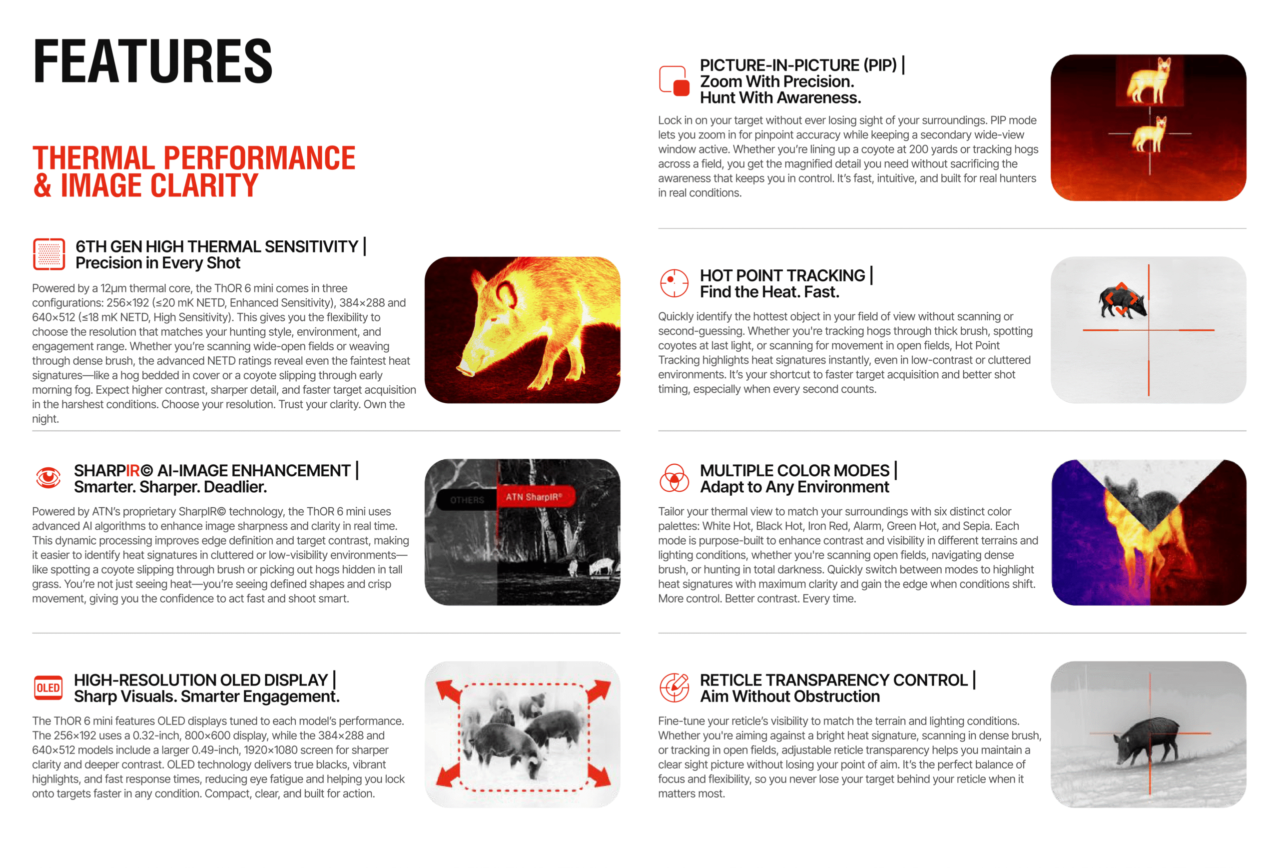 Powered by ATN’s 6th Generation thermal processing platform, the ThOR 6 Mini 640 delivers smoother tracking, enhanced detail refinement, and real-time image optimization — giving hunters faster decision-making capability when it matters most.