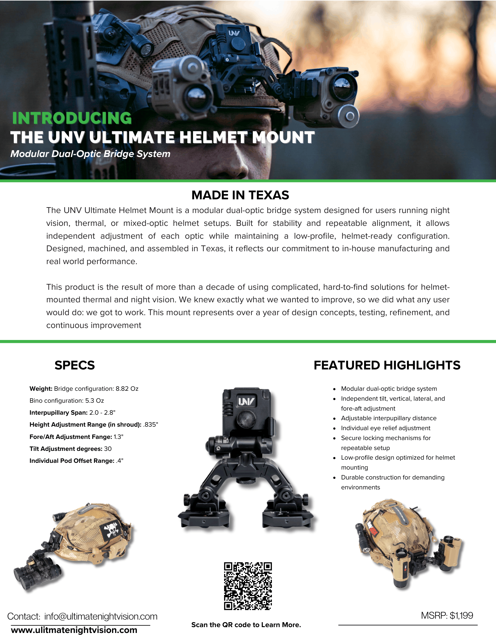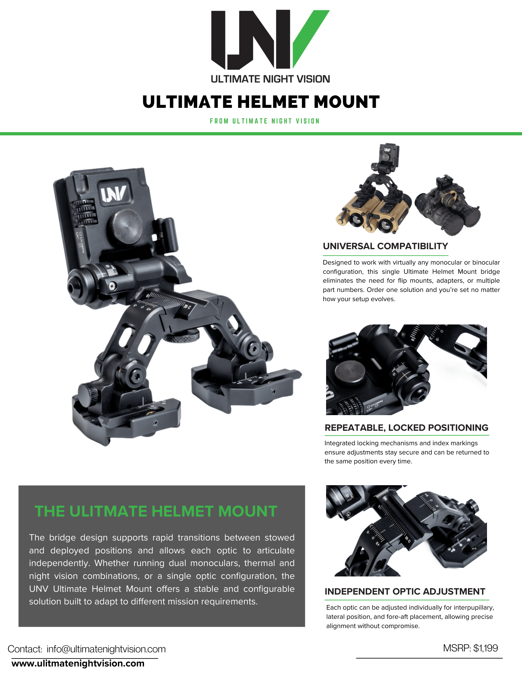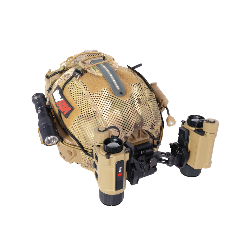 The bridge design supports rapid transitions between stowed and deployed positions and allows each optic to articulate independently. Whether running dual monoculars, thermal and night vision combinations, or a single optic configuration, the UNV Ultimate Helmet Mount offers a stable and configurable solution built to adapt to different mission requirements.